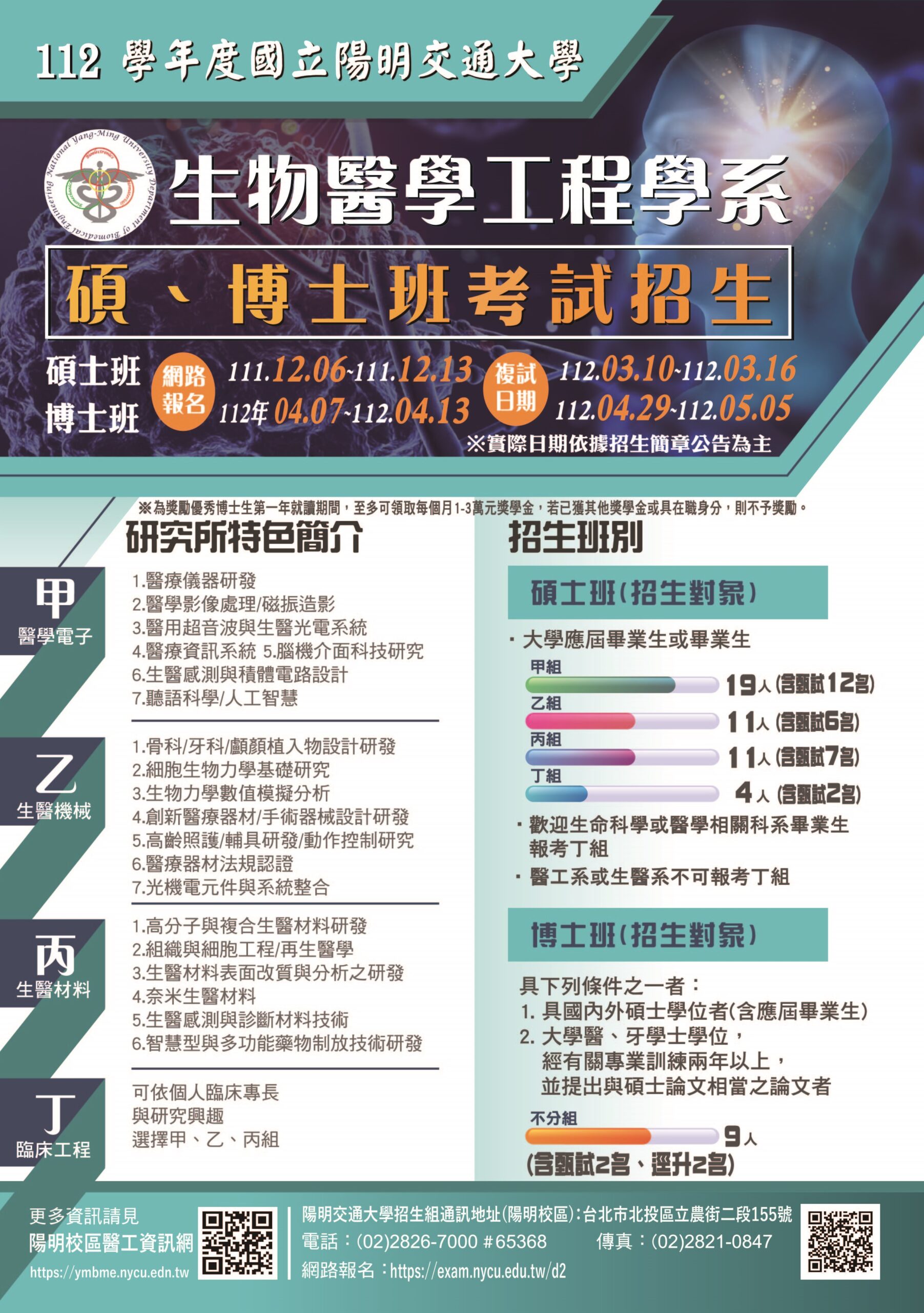 國立陽明交通大學 生物醫學工程學系 112學年博士考試招生公告 3 月 7, 2023 | 招生與試務 簡章連結 https://exam.nycu.edu.tw/d2/ 附件下載 碩博考試招生112年