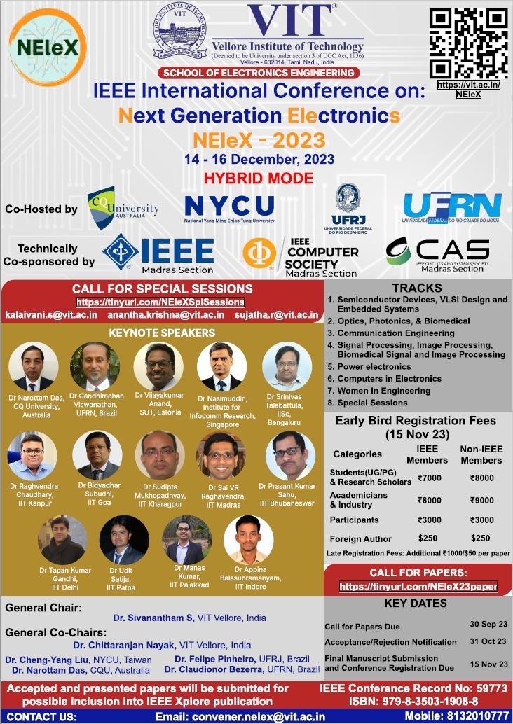 IEEE International Conference on Next Generation Electronics 2023國際研討會徵求投稿,可視訊報告 9 月 15, 2023 | 研討會及相關徵稿資訊 轉知IEEE International Conference on Next Generation Electronics 2023國際研討會徵稿訊息,可視訊報告。 詳情請參考官方網頁:https://vit.ac.in/NEleX/ 附件下載 IEEE2023