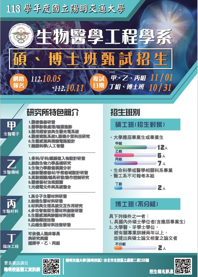 113學年度本系碩博士班熱烈招生中!!(含學士班直升碩士班獎學金資訊) 9 月 22, 2023 | 修課/學位/獎學金 本系113年度碩博士班的招生即將於10月5日開放報名,歡迎有興趣的同學們報名! 詳細時程資訊可以參考海報內容,大學部直升碩士班獎學金內容請參考附件(祥龍國際獎學金、學士班逕碩獎學金(江惠華教授捐贈)) 網路報名:112.10.05~112.10.11 複試日期: (甲、乙、丙組)112.11.01 (丁組、博士班)112.10.31 Order by Date Name 附件下載 113學年度醫工所碩博班招生海報 2023祥龍國際獎學金申請辦法 陽明交大醫工系大學生逕讀碩士獎學金實施辦法