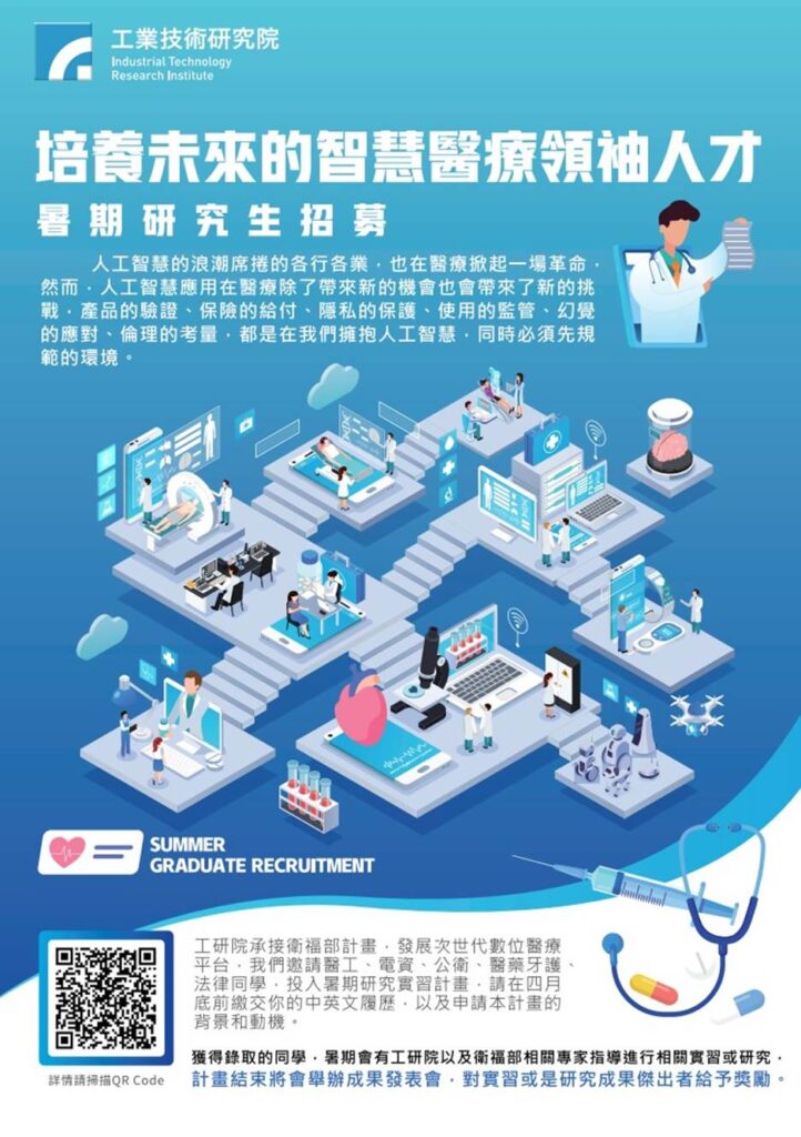轉知廠商暑期實習徵才資訊-工研院招募_衛福部/培養未來的智慧醫療領袖人才 2024暑期實習生